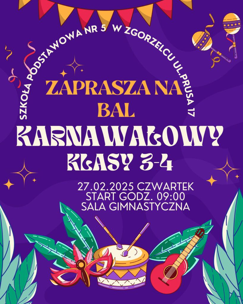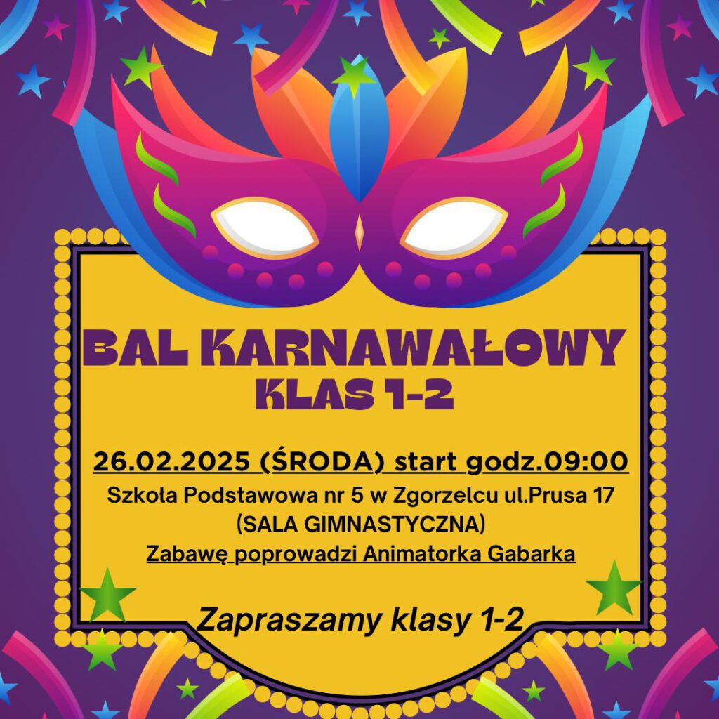 Zapraszamy na Bal Karnawałowy uczniów klas 1-4, który odbędzie się 26.02.2025 (środa) – klasy 1-2, oraz 27.02.2025 (czwartek) klasy 3-4. Obie imprezy odbędą się na Sali Gimnastycznej w budynku przy ul. Prusa 17. Wszystkie dzieci serdecznie zapraszamy!