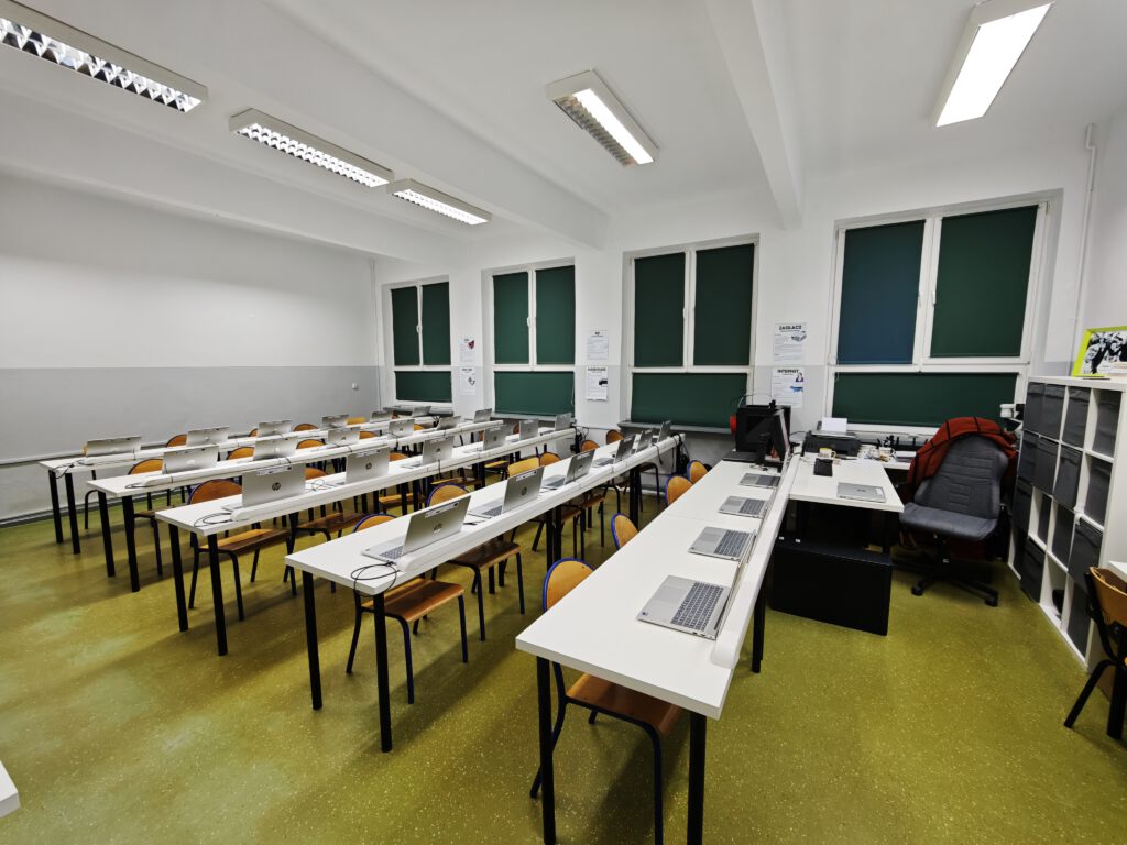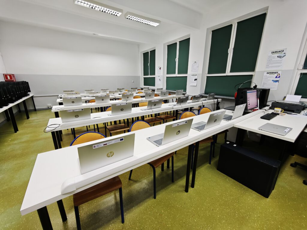 Największą zmianę widać jednak w samym gabinecie informatycznym, który po feriach będzie nam służyć jako gabinet matematyczno-informatyczny. Nie jest to już klasyczna „sala komputerowa” w starym stylu. Przekształciliśmy ją w salę uniwersalną, zmieniając całkowicie układ biurek i wprowadzając 30 dedykowanych laptopów.