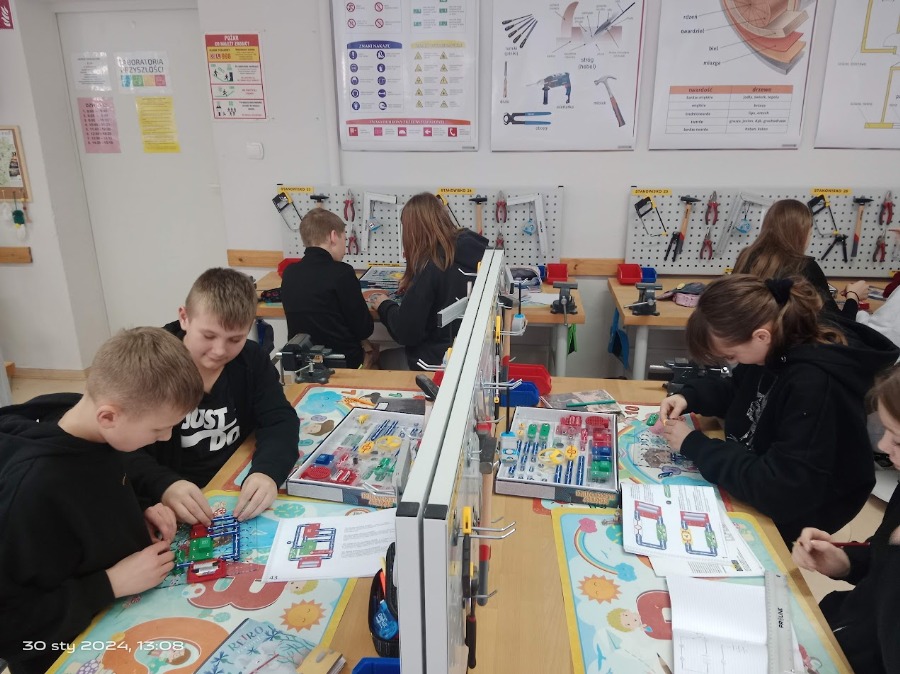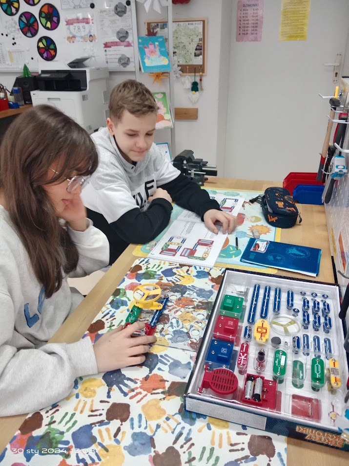 Podczas lekcji techniki w klasach szóstych uczniowie budują obwody elektryczne korzystając z wyposażenia pracowni: SEKRETY ELEKTRONIKI. Zestawy edukacyjne zostały zakupione w ramach projektu Laboratoria przyszłości. Uczniowie stosują w praktyce zdobytą wiedzę, budują obwody łącząc elementy szeregowo i równolegle, czytają schematy i samodzielnie rysują obwody z zastosowanie symboli.
