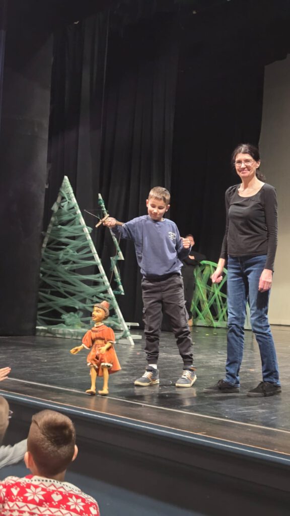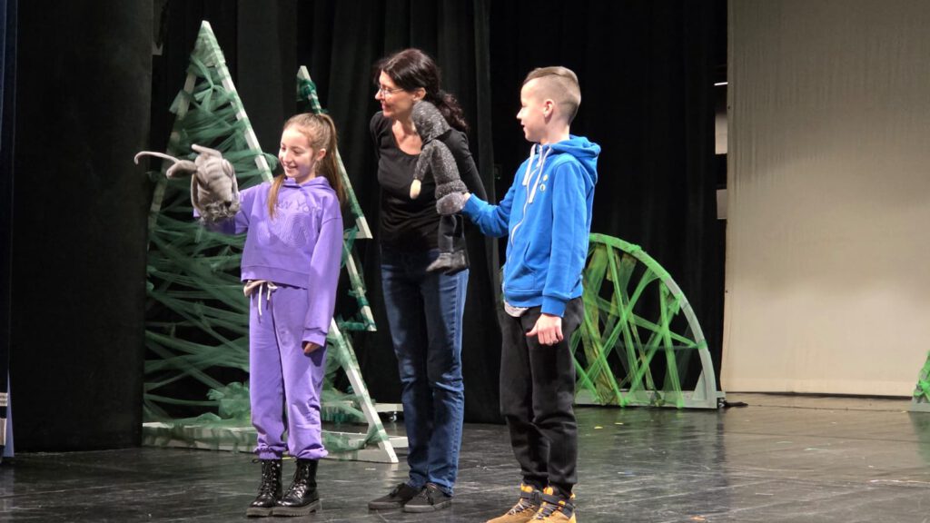 Następnie grupa wzięła udział w warsztatach teatralnych. Podczas zajęć odbył się pokaz profesjonalnych lalek teatralnych, w trakcie którego omówiono techniki ich animacji. W części praktycznej uczniowie mieli możliwość bezpośredniej pracy z rekwizytem, testując mechanizmy poruszania różnymi typami lalek.
